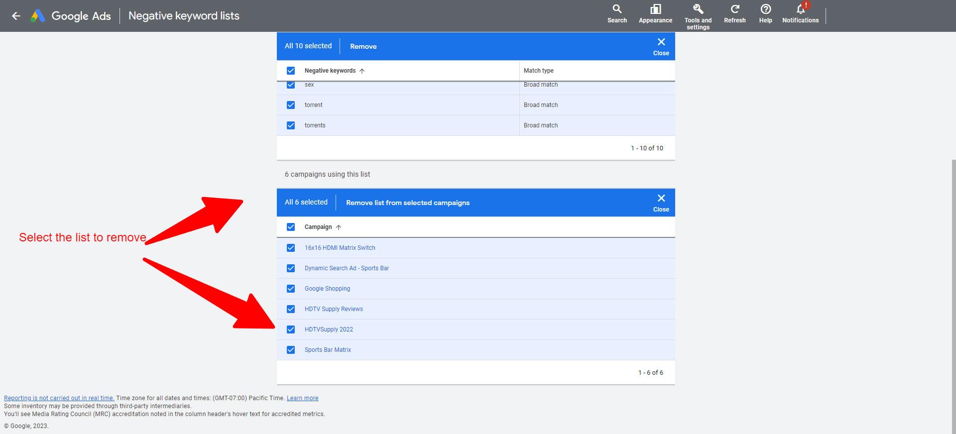 - To remove negative keyword lists, select Remove negative keyword lists.